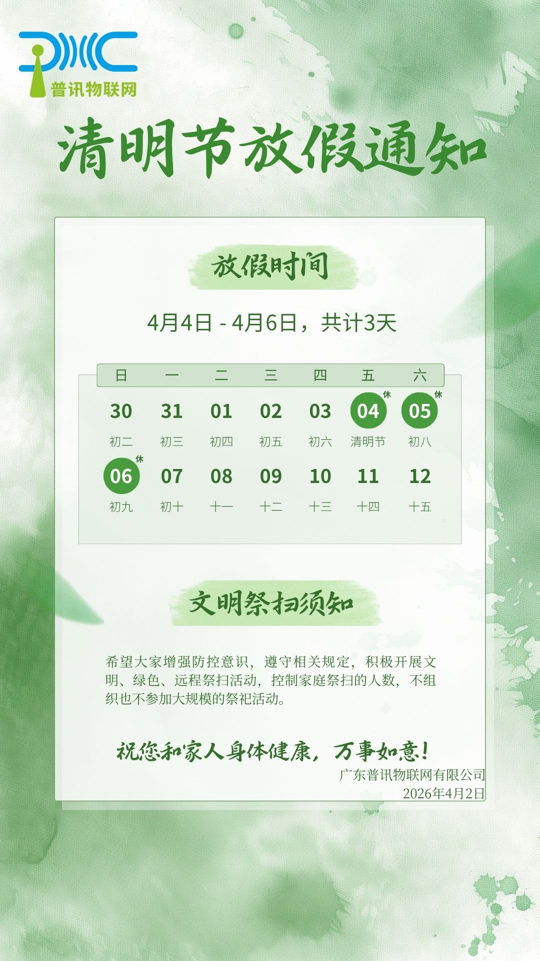 关于本公司2026年清明节放假安排如下